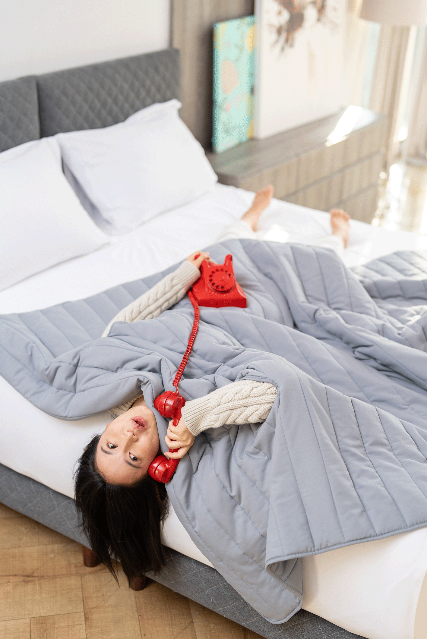 The HANDS-FREE Blanket offers supreme softness with Anti-aging MicroSilk fabric, featuring 990 thread counts per 10 square centimeters. The fabric's smooth texture is gentle on the skin, minimizing friction and pressure that could lead to wrinkles.